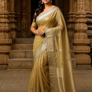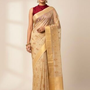 Gold Beige Chanderi Tissue Silk Saree with floral meenakari booties all over