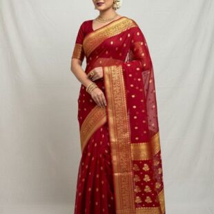 Handwoven Red Chanderi Katan Silk Saree – Golden Zari Border & Boties