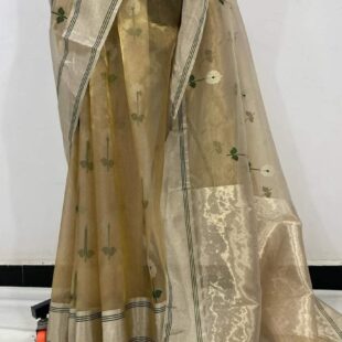 Gold Beige Chanderi Tissue Silk Saree with floral meenakari booties all over