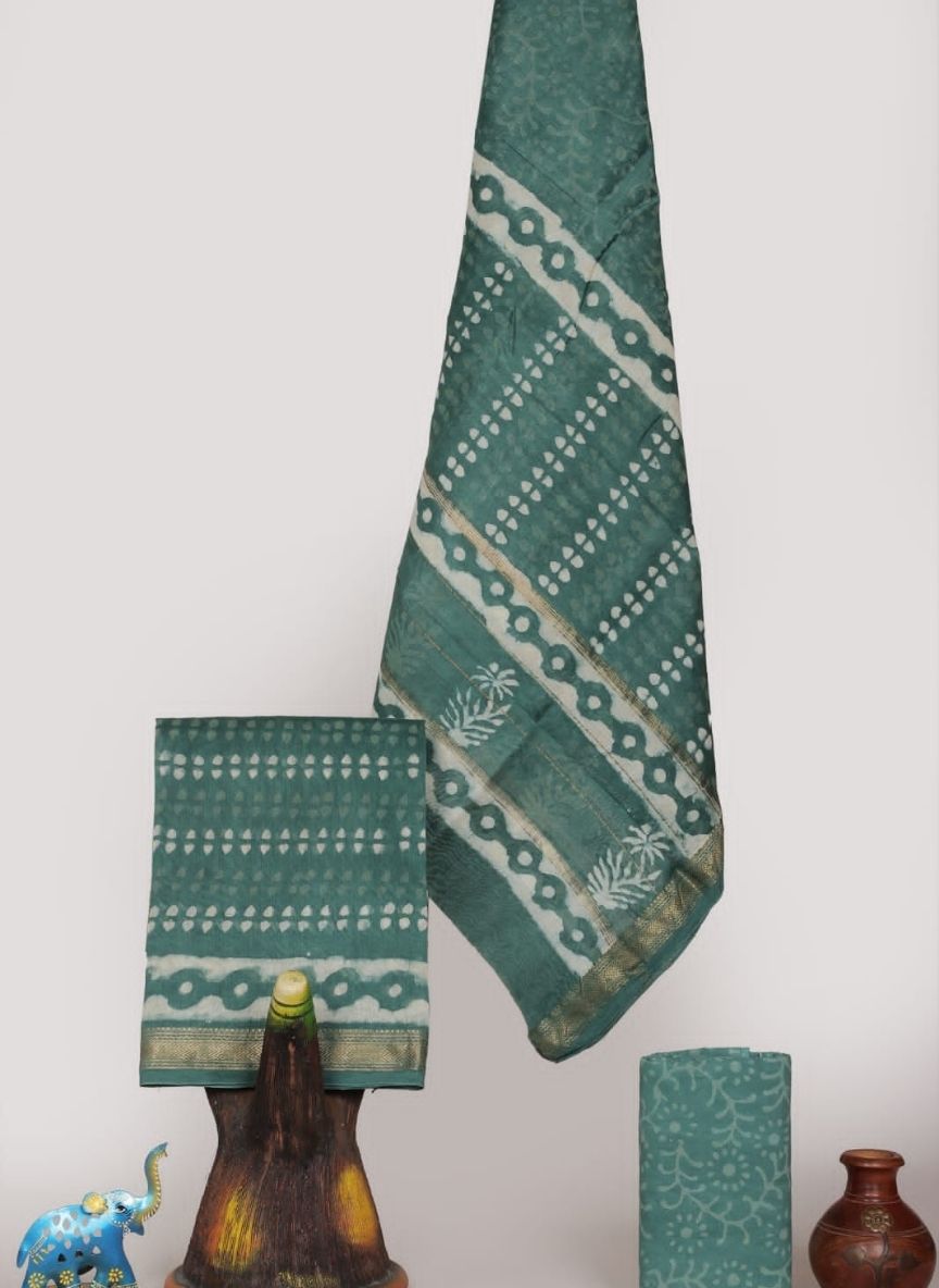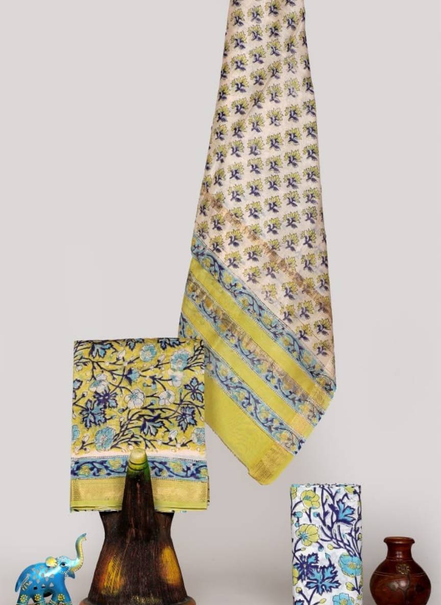 Experience the effortless luxury of Maheshwari Silk by Cotton hand block printed suits , with Maheshwari border on top and dupatta. Perfect for Office and party wear.