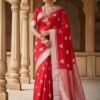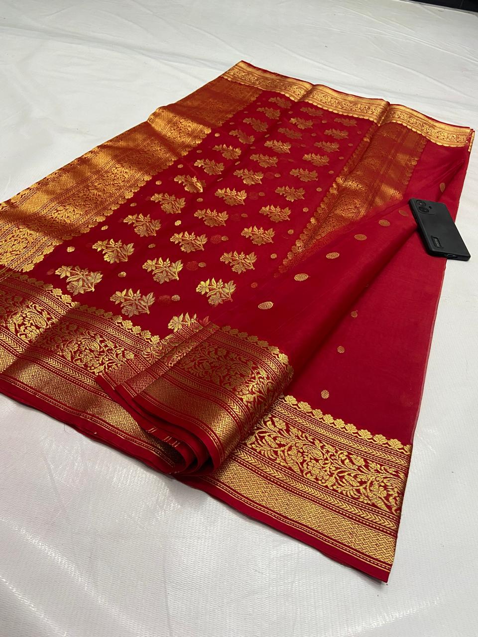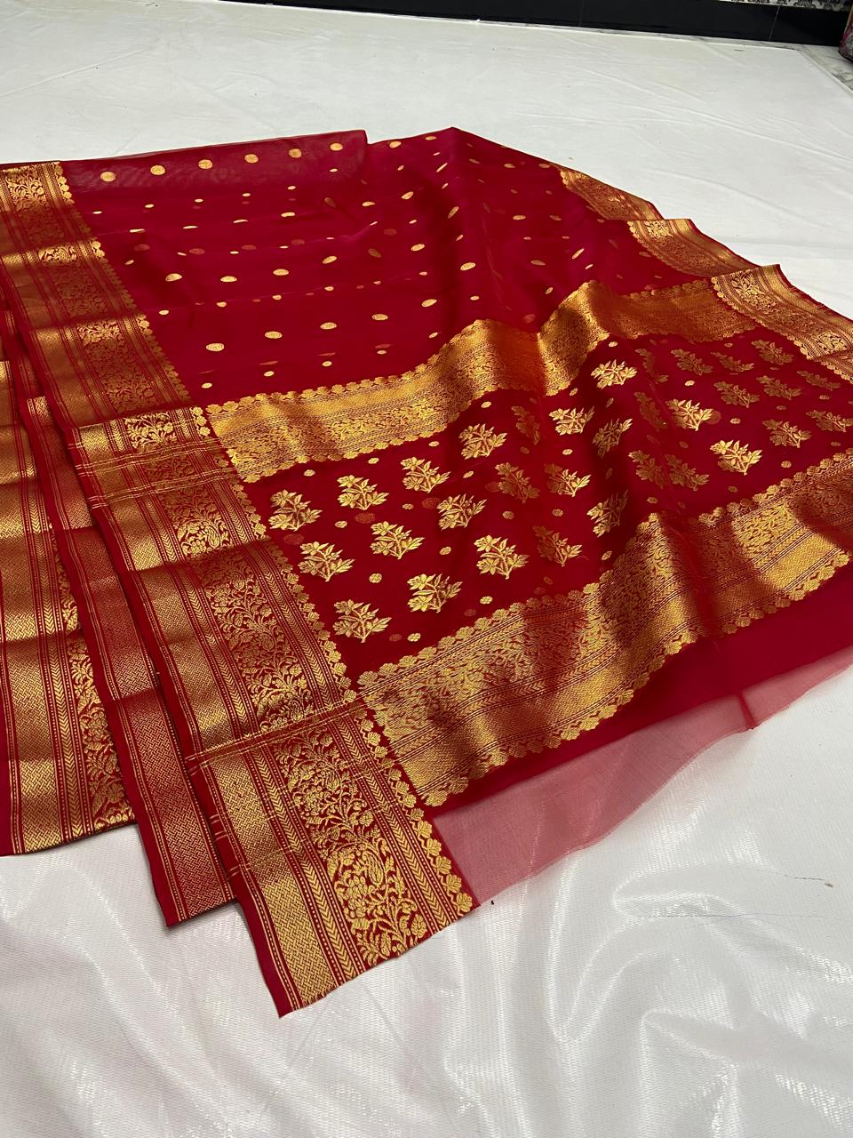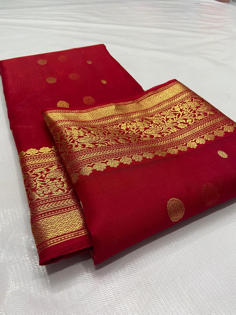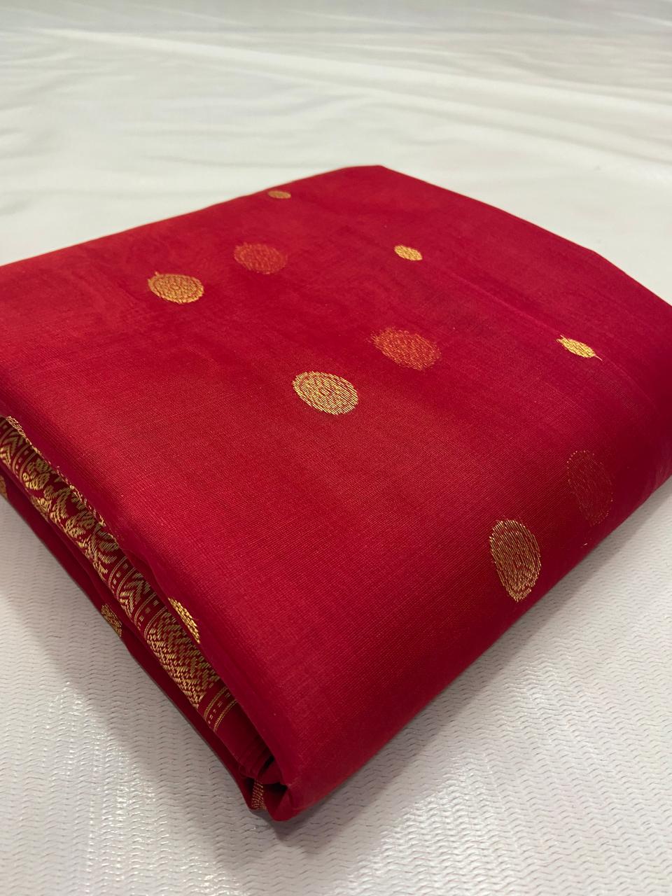 Handloom Red Chanderi Katan Silk Saree – Golden Zari Border & Boties